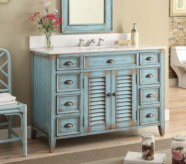 The Abbeville series with either a vibrant light blue or a gentle beige color perfectly fits any comfy and familiar bathroom style. The tastefully distressed paint lends the Abbeville vanities a worn and rustic look that emphasizes a homey feeling in your dream bathroom. The boxy drawers and shuttered doors reaffirm a rugged and functional piece that can hold all the toiletries you need in your bathroom. The most popular of the series, the 46" Abbeville Distressed Farmhouse Style Blue Bathroom Vanity is praised by many of the following reviewers.