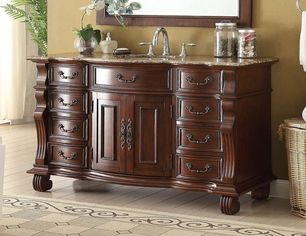 The Hopkinton series commands attention as the strongest statement you can make for your bathroom centerpiece. The solid, hardwood construction with a rich and dark brown finish projects wealth, status, and power. With rounded contours shaping its drawers and tasteful grooves etched into its sides, the vanity catches the surrounding light to draw the eye. Only offered in the largest sizes 50 inches and above, this vanity is sure to impress. You may find that the reviewers for the 60" Traditional Style Cherry Wood Hopkinton Bathroom Sink Vanity tend to agree.